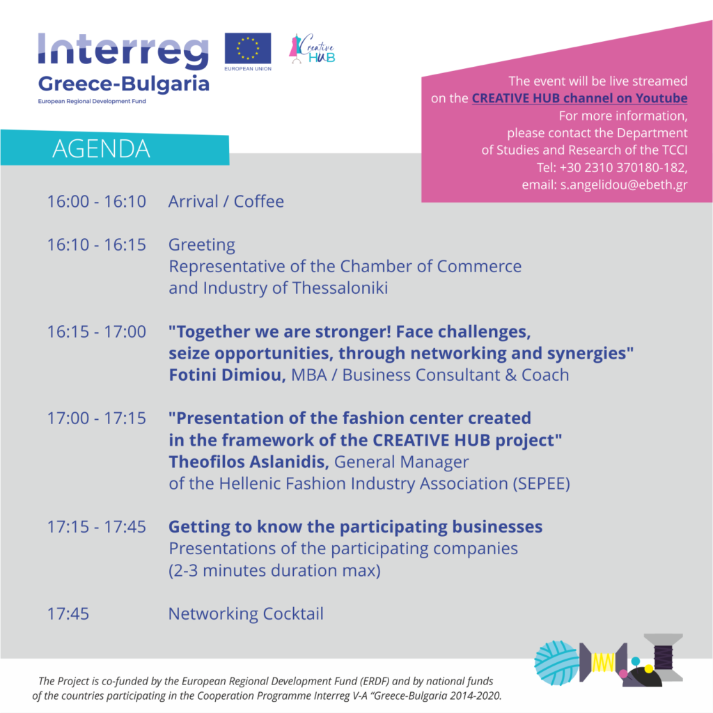 The workshop is organized in the framework of the CREATIVE HUB project and aspires to highlight the benefits that can arise for businesses in the clothing industry and the wider fashion sector, through networking and the development of partnerships with each other and with the competent bodies supporting entrepreneurship.