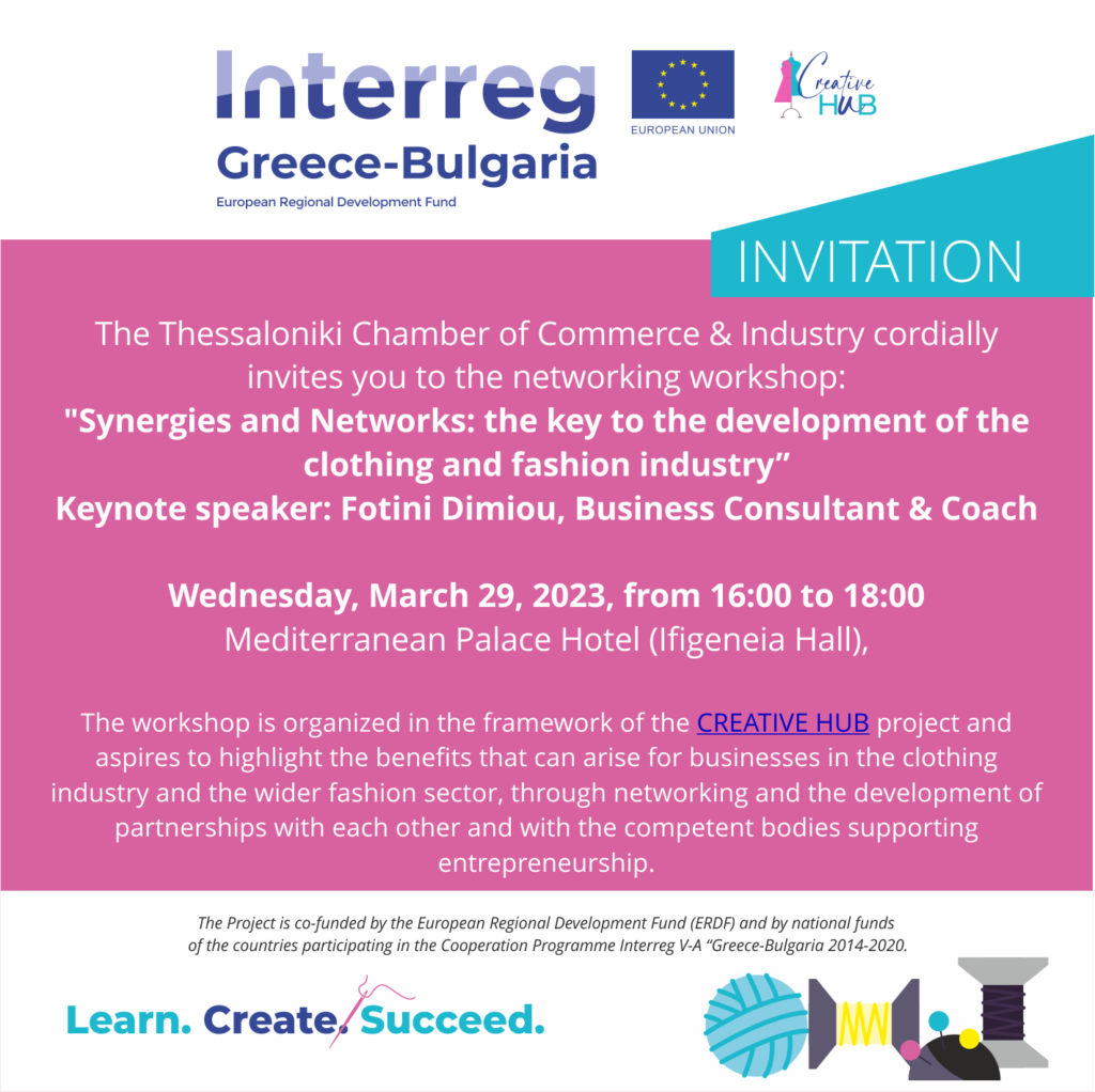 The Thessaloniki Chamber of Commerce & Industry cordially invites you to the Networking Workshop “Synergies and Networks: the key to the development of the clothing and fashion industry”, on Wednesday, March 29, 2023, 16:00-18:00, at the Mediterranean Palace Hotel (Hall “Nafsika”), Salaminos 3 & Karatasou, Thessaloniki.